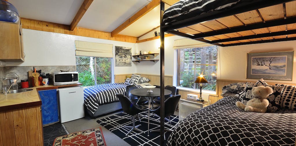 The Black and White room is one of the three individually designed and styled bedrooms in the “Art House”. There are two double beds and a single bed. One double bed is elevated in a loft. All beautiful linen and down doonas and super topped beds are supplied.